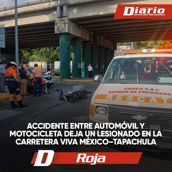 Accidente entre automóvil y motocicleta deja un lesionado en la carretera Viva México–Tapachula