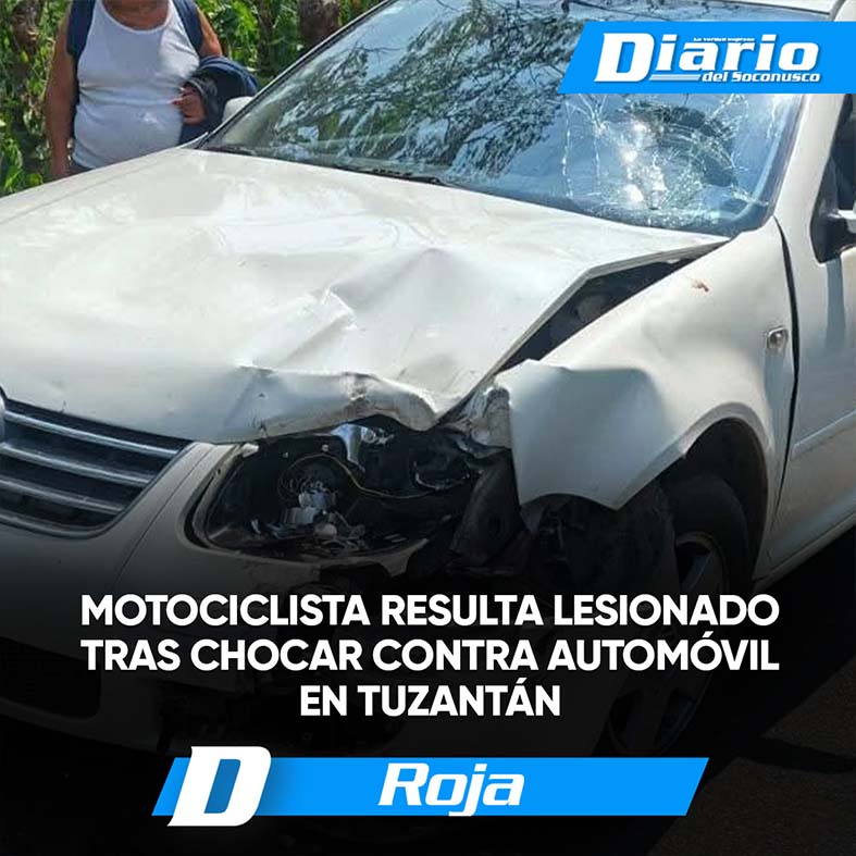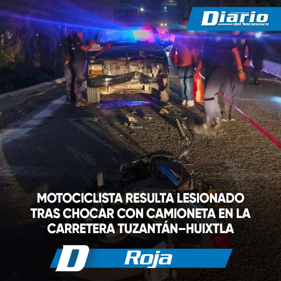 Darinel González Un fuerte accidente entre una motocicleta y una camioneta dejó como saldo a un motociclista lesionado sobre la carretera Tuzantán–Huixtla, a la altura de la curva del puente