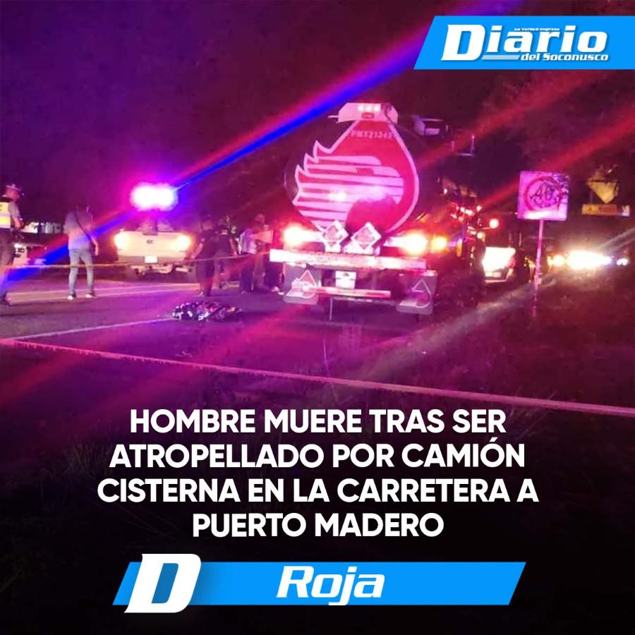 M de R Un trágico accidente se registró la noche del lunes sobre la carretera Tapachula–Puerto Madero, donde un hombre perdió la vida al ser embestido por un camión cisterna