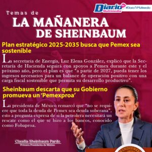 Pemex es rentable, asegura Sheinbaum La Presidenta aseguró que Petróleos Mexicanos es una empresa rentable y a partir de 2027, púes la deuda que adquirió en el pasado, con el apoyo
