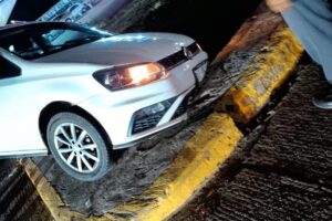 *Vehículo estuvo a punto de caer al dren pluvial frente a Plaza Galerías. Darinel González Un automóvil Volkswagen Vento de color blanco estuvo a punto de caer al dren pluvial