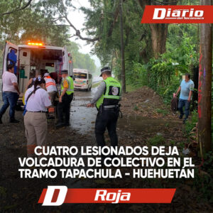 Darinel González Una unidad del transporte público de la ruta Huixtla – Tapachula, perteneciente a la empresa Paulino Navarro y con número económico H03, terminó volcada y fuera del camino