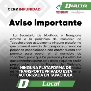 La Secretaría de Movilidad y Transporte de Chiapas emitió un aviso dirigido a la población del municipio de Tapachula, en el que informa que ninguna plataforma digital de transporte privado