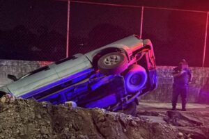 Darinel González Durante los primeros minutos de este lunes, una camioneta Nissan Frontier color gris terminó volcada luego de caer en un zanjo sobre la Central Avenida Norte, a la