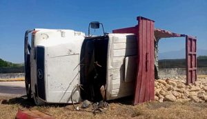 Darinel González Daños materiales fue el saldo de la volcadura de un camión de volteo marca Mercedes Benz, de color blanco con rojo, que transportaba piedras, en hechos registrados sobre