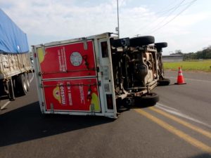 Una camioneta de reparto perteneciente a una conocida empresa de frituras terminó volcada sobre el libramiento sur oriente, a la altura de la Rotonda del Sacrificio, en el tramo que