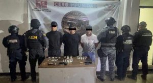 M de R Fuerzas policiales detuvieron a tres aún etos por los delitos de violación a la Ley Federal de Armas de Fuego y Explosivos y contra la salud en
