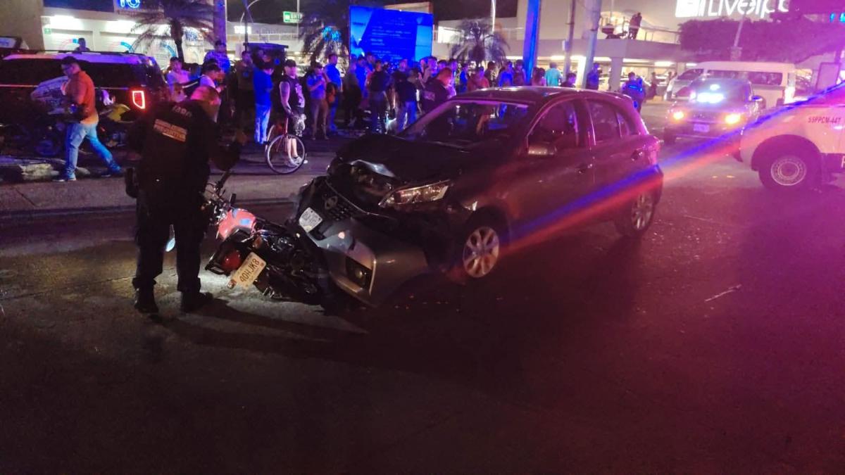 La noche de este lunes se registró un accidente vehicular en la 4ª Avenida Sur Prolongación y Calzada Las Palmas, frente a una conocida plaza comercial de Tapachula, que dejó como saldo una persona lesionada y daños materiales.
