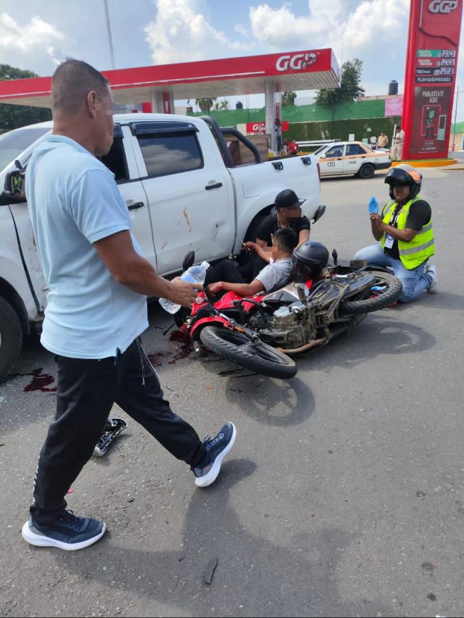 Un motociclista resultó lesionado y se registraron daños materiales tras un accidente ocurrido sobre el bulevar de la 8ª Avenida Norte, a la altura del entronque con la glorieta de la bajada Pérez Herrera, colonia 5 de febrero