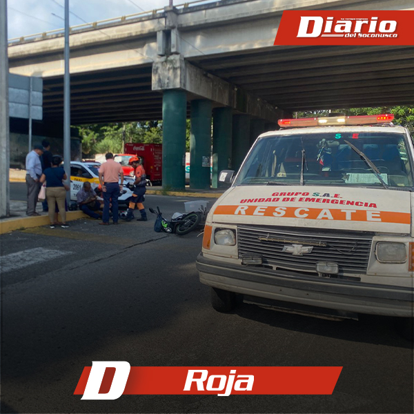La mañana de este miércoles se registró un accidente vehicular en la lateral de la carretera Costera Viva México–Tapachula, a la altura de la Central Calle Poniente, donde un automóvil Chevrolet Chevy blanco y una motocicleta Italika FT150 negra con verde se vieron involucrados.