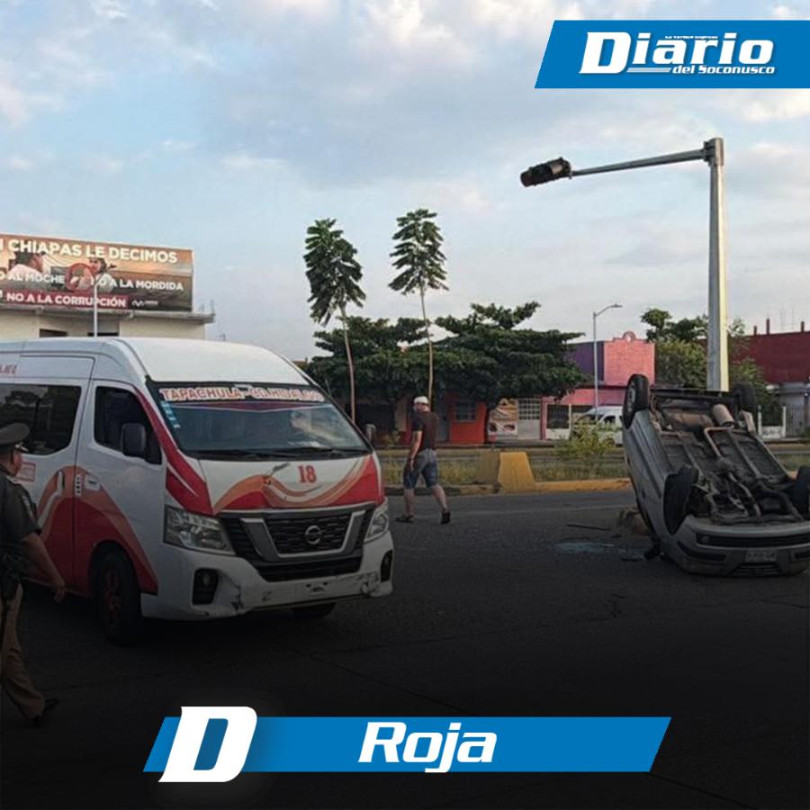 Presuntamente, una de las unidades no respetó la señal de alto, lo que provocó el impacto. Tras la colisión, el vehículo particular volcó y quedó sobre su toldo, obstruyendo parcialmente la vialidad.