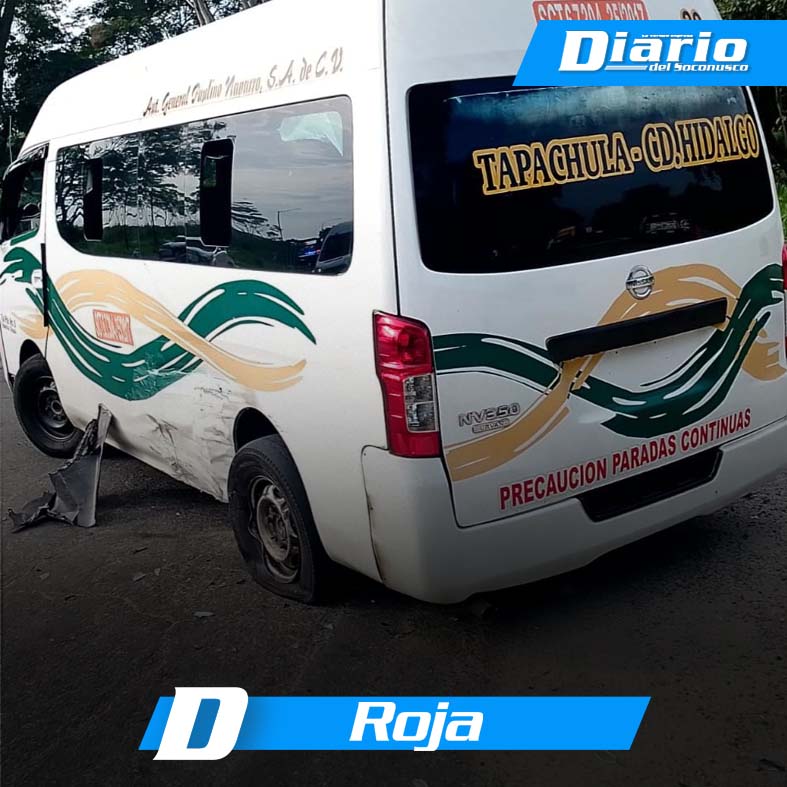 Se trató de un automóvil Toyota Yaris color gris, el cual presentaba daños materiales en el costado delantero izquierdo, así como una colectiva Nissan Urvan color blanco con franjas amarillas y verdes, perteneciente a la ruta Tapachula–Ciudad Hidalgo, con número económico 29, misma que presentaba afectaciones en el costado izquierdo.