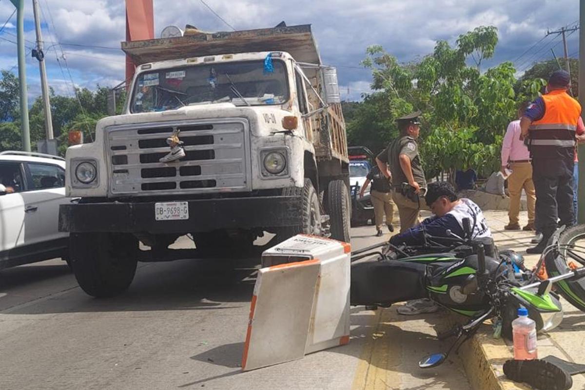 Un camión tipo volteo impactó a un motociclista y lo arrastró varios metros, causándole varias lesiones