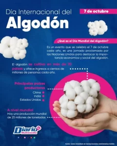 Es un evento que se celebra el 7 de octubre cada año, es una jornada proclamada por las Naciones Unidas para destacar la impor-tancia económica y social del algodón.