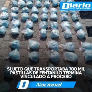 México.– Un hombre detenido por transportar aproximadamente 700 mil pastillas de fentanilo fue vinculado a proceso por su presunta responsabilidad en delitos contra la salud, informaron autoridades federales. De acuerdo
