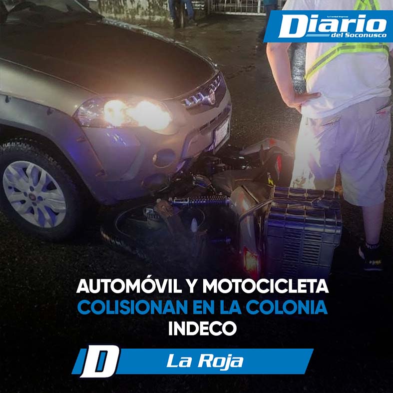 La noche del martes se registró un accidente vial entre un automóvil Fiat Palio color arena y una motocicleta Italika 125Z de color gris con negro, sobre la 11ª Avenida Sur, a la altura de la colonia Indeco, que dejó como saldo únicamente daños materiales.