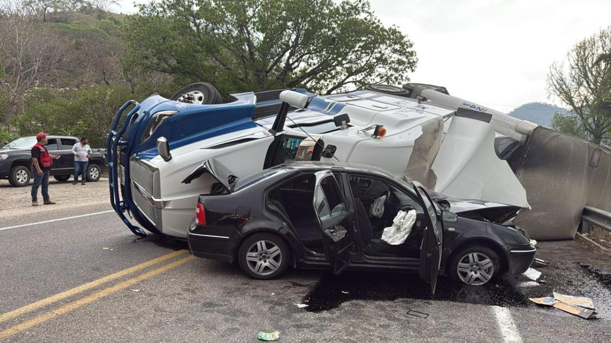 El percance ocurrió a la altura del kilómetro 12, en el tramo conocido como Los Tamarindos, donde la pesada unidad, presuntamente fuera de control, terminó volcada a un costado de la vía, impactando durante su trayectoria a un automóvil compacto Volkswagen Jetta en el que viajaban tres personas.