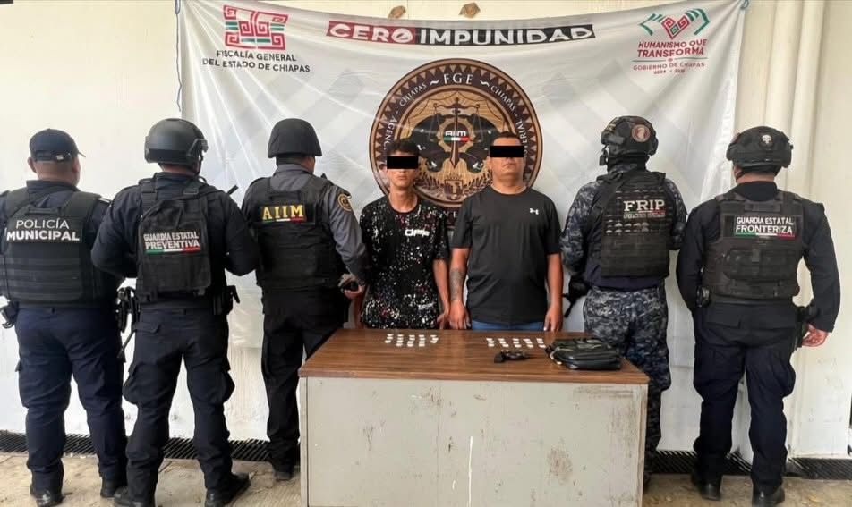 La Secretaría de Seguridad del Pueblo (SSP) a través de la Fuerza de Reacción Inmediata Pakal (FRIP), Guardia Estatal Preventiva y Guardia Estatal Fronteriza en coordinación con la Agencia de Investigación e Inteligencia Ministerial (AIIM) de la Fiscalía General del Estado (FGE), detuvieron a dos presuntos responsables de los delitos contra la salud y violación a la Ley Federal de Armas de Fuego y Explosivos, en el municipio de Tapachula.