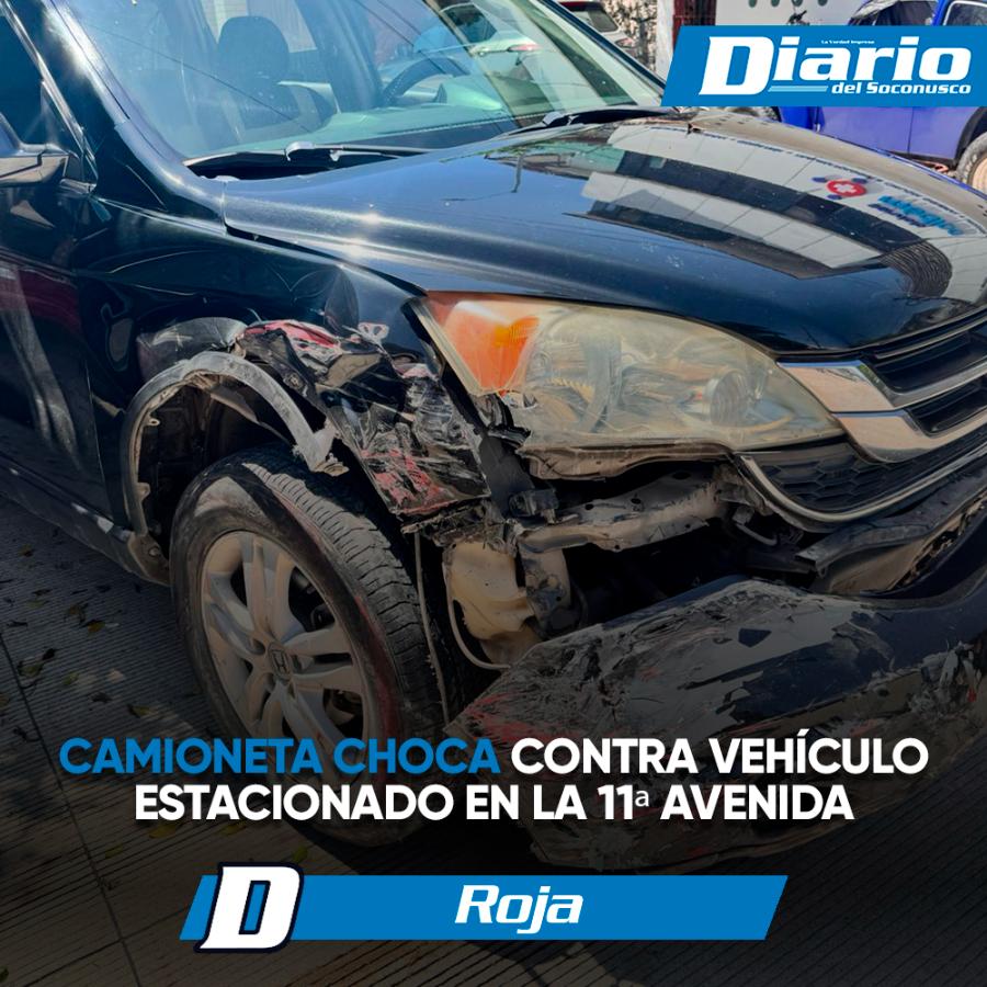 Alrededor de las 11:30 de la mañana de este lunes se registró un accidente vehicular sobre la 11ª Avenida Norte, entre la 11ª y 13ª Calle Oriente colonia centro de Tapachula. El percance involucró a una camioneta Honda CR-V de color negro que colisionó a un vehículo Chevrolet Aveo de color rojo estacionado.