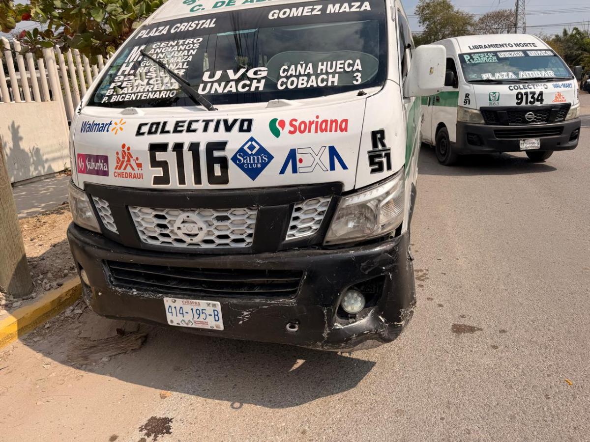 Tuxtla Gutiérrez, Chiapas.– Un fuerte accidente vehicular se registró la tarde de este jueves en el cruce del Bulevar Lic. Salomón González Blanco y Boulevard Tuchtlán, en el fraccionamiento Las Torres de la capital chiapaneca, dejando como saldo daños materiales considerables en dos vehículos, uno del transporte público y otro particular.