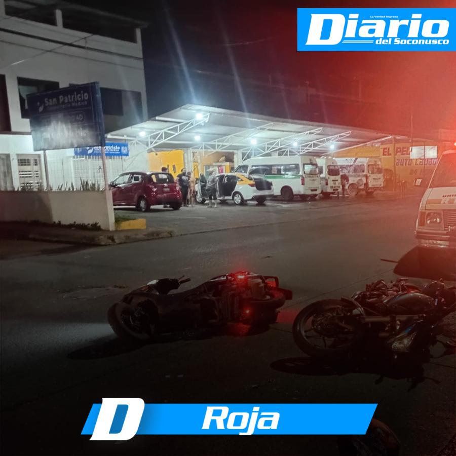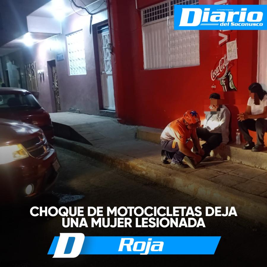 Tapachula, Chiapas. Un accidente entre motocicletas registrado en la 16ª Avenida Sur y 2ª Privada Calle Poniente dejó como saldo a una mujer lesionada, generando la movilización de cuerpos de emergencia.