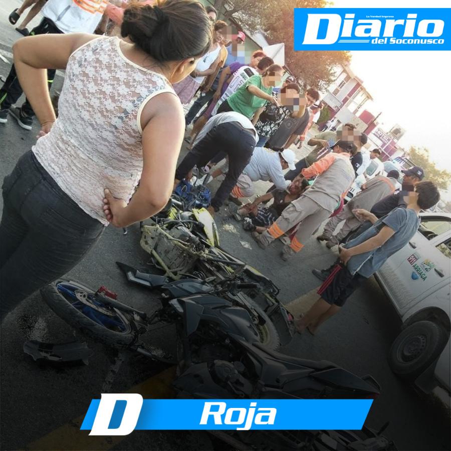 Un choque entre dos motocicletas dejó como saldo dos personas lesionadas y cuantiosos daños materiales, sobre la carretera Arriaga–Tapanatepec, a la altura de la clínica del doctor Coutiño.