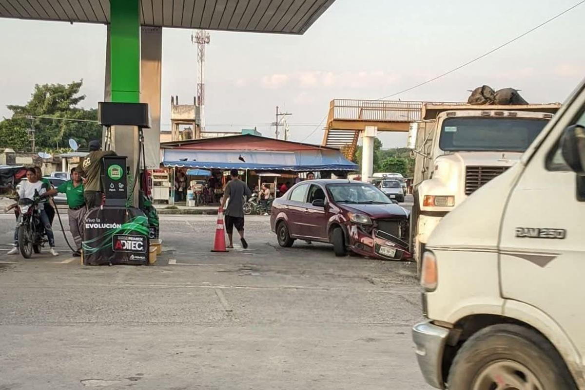 El percance ocurrió en las inmediaciones de la gasolinera ubicada en esta localidad, donde un automóvil Chevrolet Aveo de color guinda se impactó contra un camión de volteo. Debido al fuerte choque, el vehículo compacto resultó prácticamente destrozado en su parte frontal.