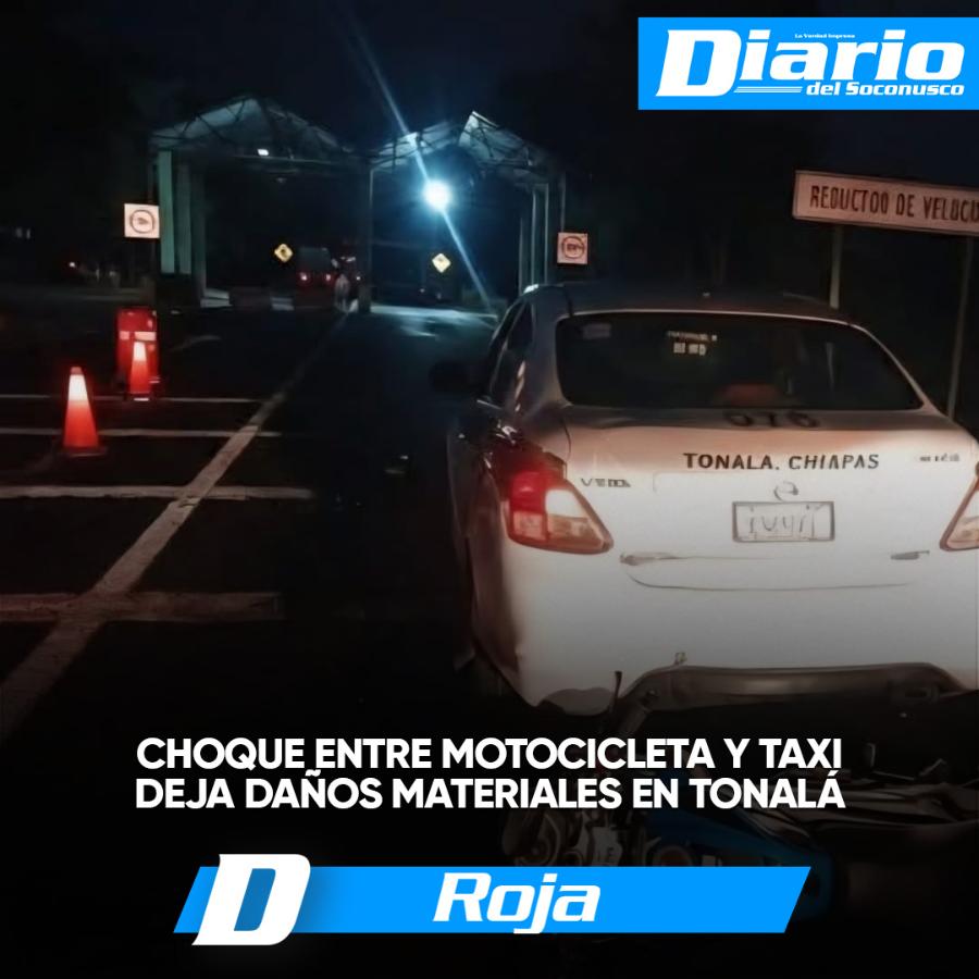 Un accidente vehicular entre una motocicleta y un taxi dejó como saldo únicamente daños materiales sobre el tramo carretero que conecta a los municipios de Tonalá y Pijijiapan, a la altura del kilómetro 78+700.