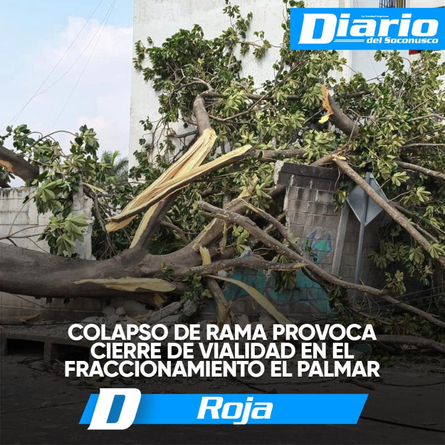 La caída de una enorme rama de un árbol de castaño provocó el colapso de una barda y el bloqueo total de la circulación sobre la 11ª avenida sur prolongación, a la altura del fraccionamiento El Palmar.
