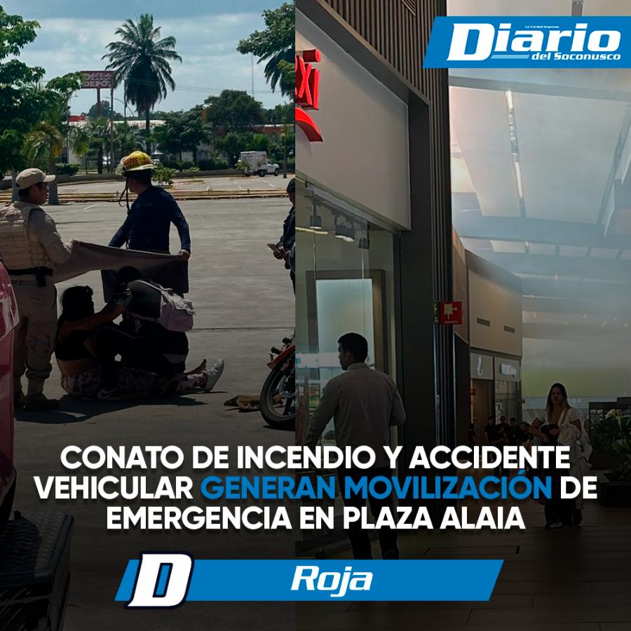 Una intensa movilización de cuerpos de emergencia se registró al medio día de este martes, en las instalaciones de Plaza Alaia Tapachula, luego del reporte de un conato de incendio en el área gourmet y un accidente vehicular en el estacionamiento del mismo centro comercial.