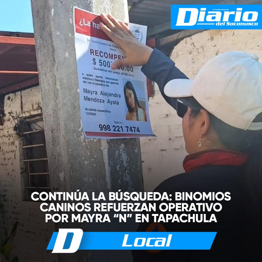 La Unidad Canina de Búsqueda y Rescate (UCBR) de la Secretaría de Protección Civil del Estado continúa realizando acciones de seguimiento y localización, trasladándose a la Fiscalía de Distrito Costa en Tapachula para coordinar la logística de búsqueda en conjunto con autoridades municipales, estatales y familiares de la C. Mayra «N», quien permanece en calidad de no localizada.
