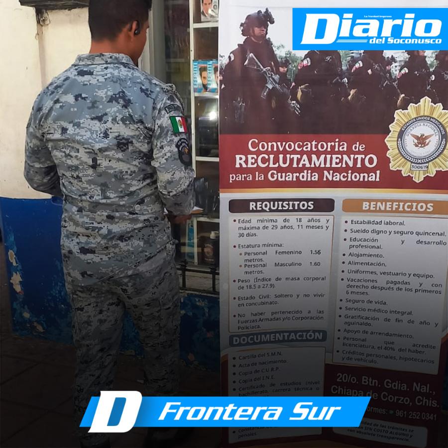 “Únete a la Guardia Nacional ¡Sé parte de la fuerza! es el llamado que hace la corporación federal a los jóvenes solteros, hombres y mujeres, a fin de que sean contratados para trabajar en Chiapas” (sic).