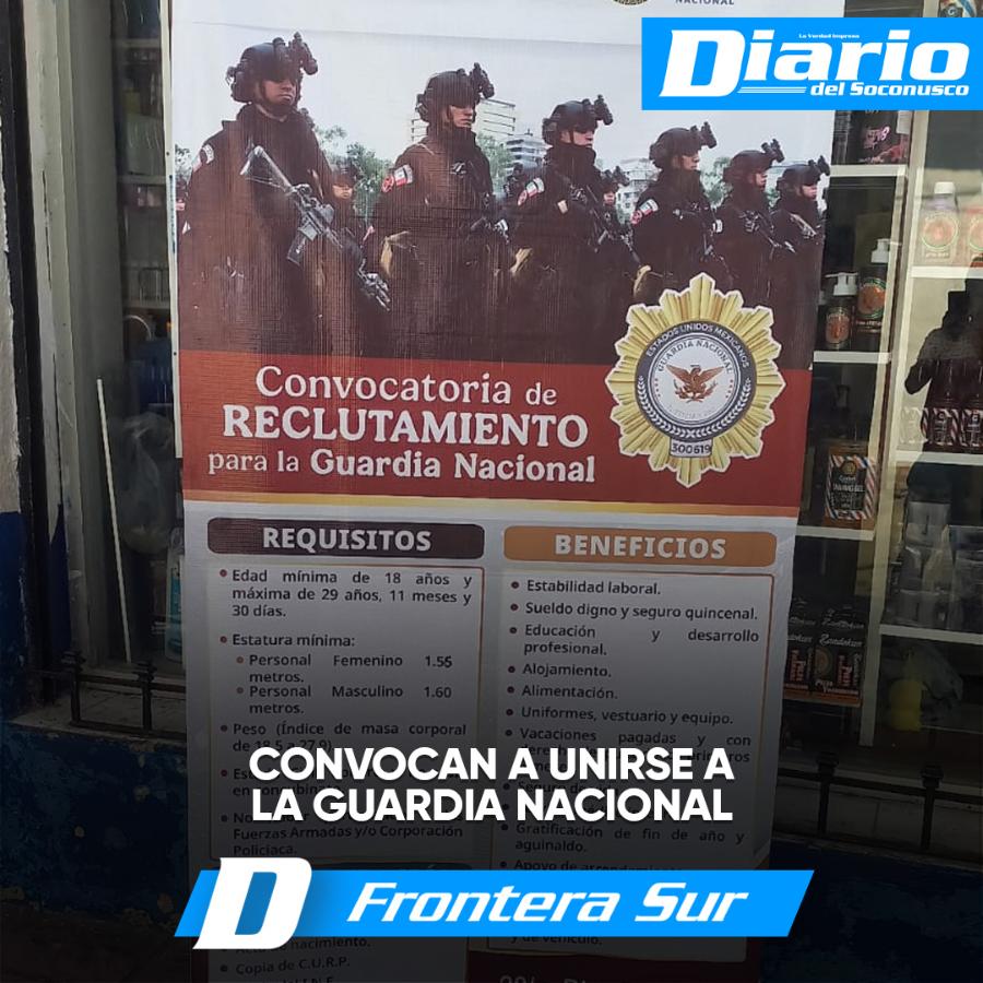 “Únete a la Guardia Nacional ¡Sé parte de la fuerza! es el llamado que hace la corporación federal a los jóvenes solteros, hombres y mujeres, a fin de que sean contratados para trabajar en Chiapas” (sic).
