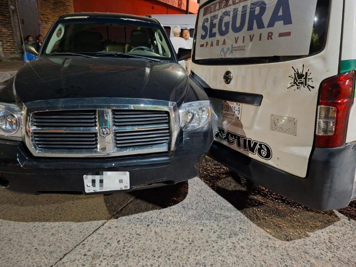 El primer percance ocurrió sobre la 26ª Calle Oriente, entre 9ª Sur y 9ª Privada Sur, frente a una gasolinera, donde estuvieron involucrados los conductores de un colectivo tipo Nissan Urvan, de color blanco con franjas verdes, y una camioneta Dodge Dakota, de color negro.