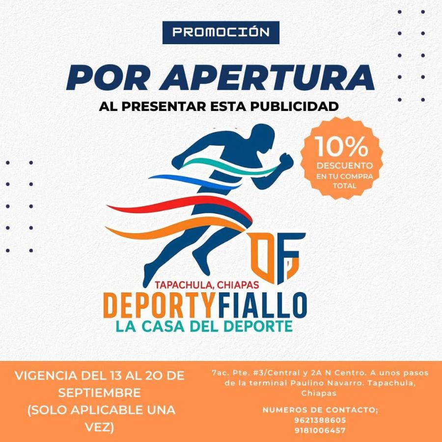 Como parte de la celebración, DeportyFiallo lanza una promoción especial para los clientes que presenten esta publicación, ya que podrán obtener un 10% de descuento en su compra total, válido una sola vez por persona, del 13 al 20 de septiembre.