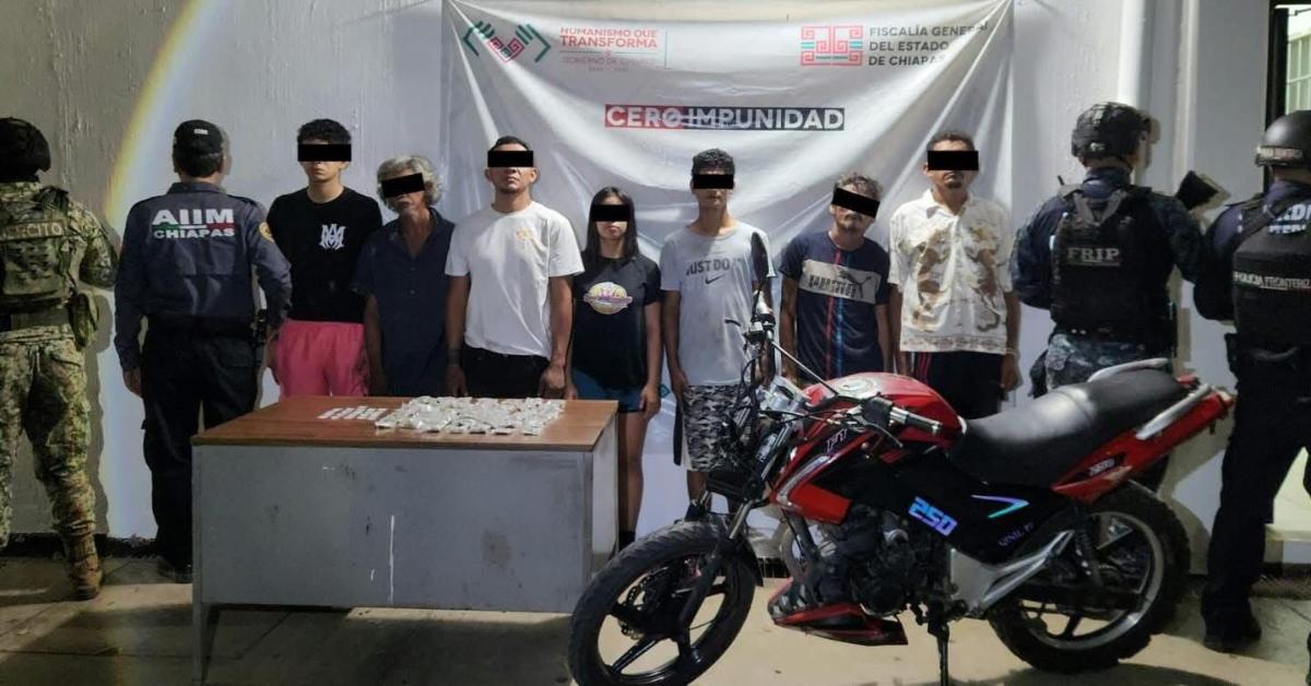 La Fiscalía General del Estado, en coordinación con el Ejército Mexicano, Marina Armada de México, Secretaría de Seguridad del Pueblo y Secretaría de Seguridad Pública Municipal de Tapachula, lograron la detención de siete personas y el aseguramiento de narcóticos en dos inmuebles, derivado de diligencias de cateos realizadas en la zona sur oriente de Tapachula.
