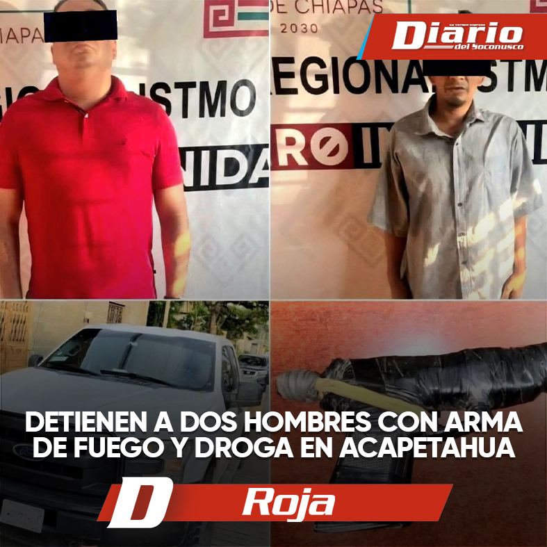 En un operativo de seguridad realizado en el municipio de Acapetahua, fueron detenidos dos hombres a quienes se les aseguró un arma de fuego y varias dosis de droga conocida como cristal.
