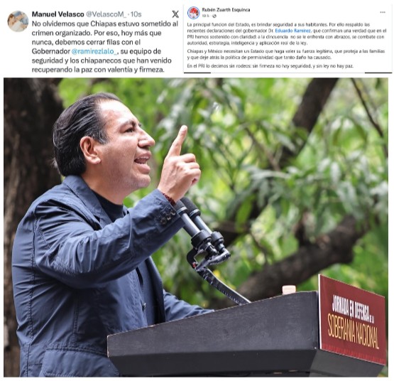 Misma situación está sucediendo: en primer lugar, el exgobernador y ahora senador por el PVEM, Manuel Velasco Coello, en su cuenta de X, dijo: “No olvidemos que Chiapas estuvo sometido al crimen organizado. Por eso, hoy más que nunca, debemos cerrar filas con el gobernador Eduardo Ramírez”; estas afirmaciones demuestran la presencia, cordialidad y sobre todo que más allá de intereses partidistas, el bienestar de Chiapas está más allá de colores, partidos e intereses personales, por ello lo dicho por Velasco Coello de cerrar filas, es prudente, necesario y oportuno en estos momentos donde las horas serenas están en juego.