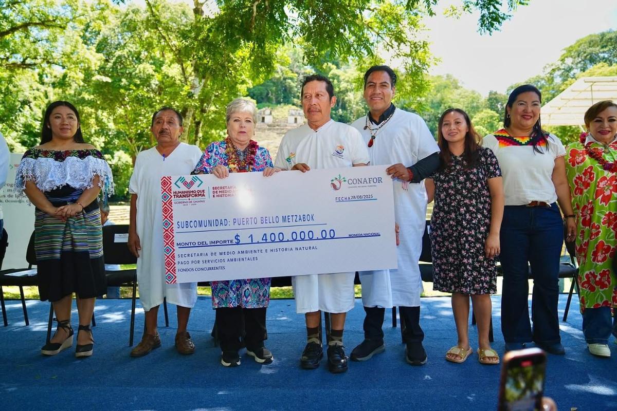 En gira de trabajo por el municipio de Ocosingo, el gobernador Eduardo Ramírez Aguilar y la secretaria de Medio Ambiente y Recursos Naturales (Semarnat), Alicia Bárcena Ibarra, visitaron la zona arqueológica de Bonampak, donde entregaron recursos del Programa de Pago por Servicios Ambientales, modalidad fondos concurrentes, a comunidades de la Selva Lacandona.