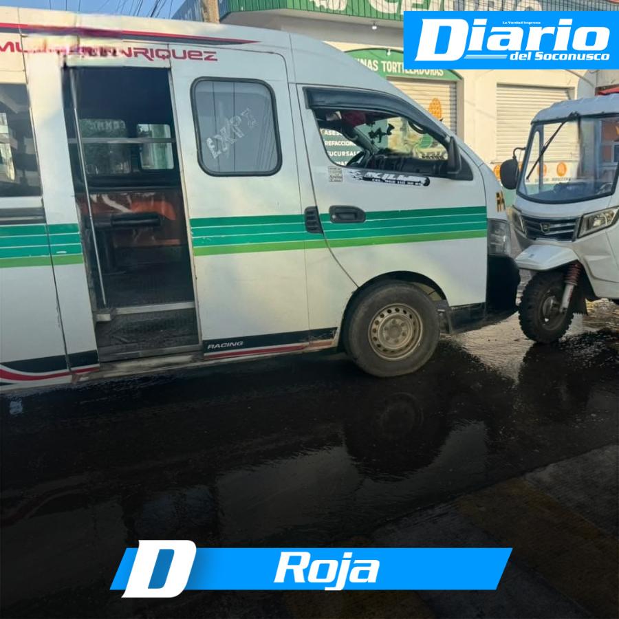 una combi del transporte público tipo Nissan Urvan, de color blanco con franjas verdes, de la ruta Reymundo Enríquez, la cual colisionó contra un motocarro de color blanco.