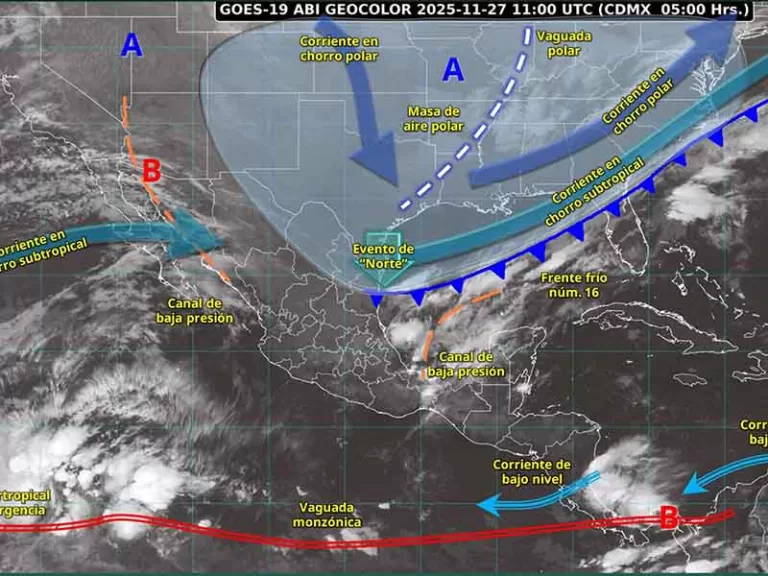 A su vez, la masa de aire polar asociada al sistema frontal mantendrá el evento de Norte de fuerte a muy fuerte, de 50 a 60 kilómetros por hora (km/h) con rachas de 70 a 90 km/h en regiones de Oaxaca y Chiapas (Istmo y Golfo de Tehuantepec); de 30 a 40 km/h con rachas de 50 a 70 km/h en la costa de Veracruz, y de 20 a 30 km/h con rachas de 40 a 60 km/h en los litorales de Tamaulipas, Tabasco, Campeche, Yucatán y Quintana Roo (norte).