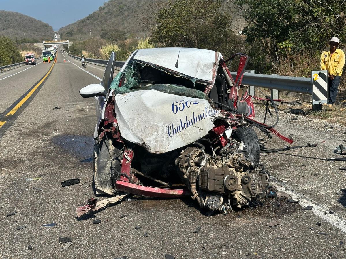 Cerca de las 14 horas se tuvo conocimiento del percance por lo que de inmediato personal de socorro se trasladó al kilómetro citado donde encontró un vehículo de color azul con blanco, marca Chevrolet, tipo Aveo, en su modalidad de Taxi del municipio de Chalchihuitán, hecho pedazos, el conductor estaba prensado entre los fierros retorcidos y el copiloto también resultó lesionado.