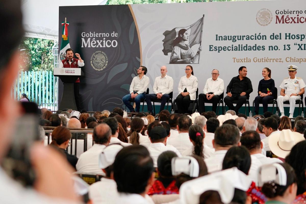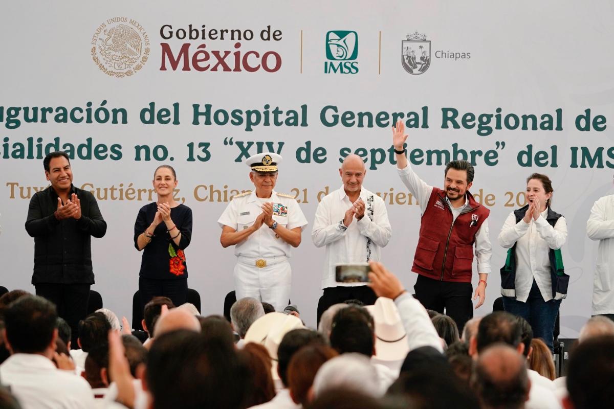 El Instituto Mexicano del Seguro Social (IMSS) fortalece la infraestructura en salud y servicios de especialidad en Chiapas con la inauguración del Hospital General Regional (HGR) de Especialidades “XIV de Septiembre” en Tuxtla Gutiérrez, que beneficia a un millón 37 mil 900 derechohabientes con atención médica inclusiva e integral.