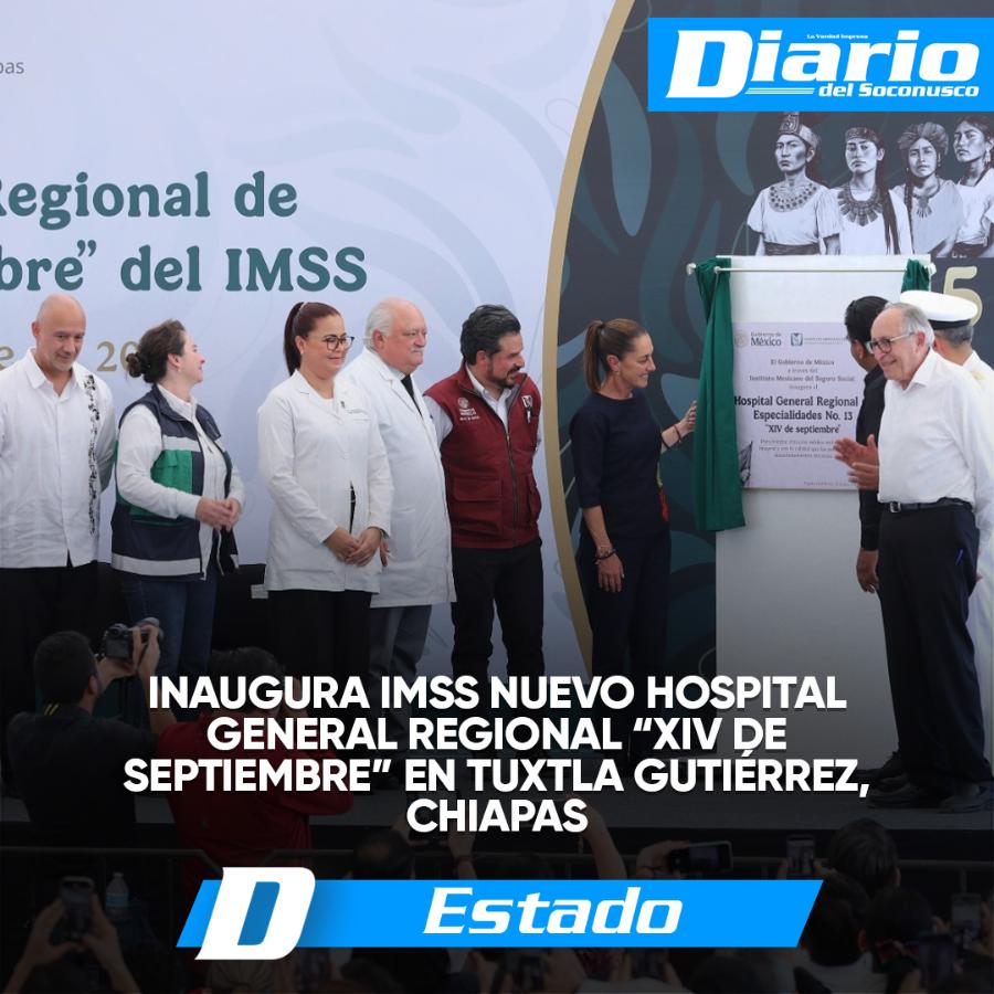 El Instituto Mexicano del Seguro Social (IMSS) fortalece la infraestructura en salud y servicios de especialidad en Chiapas con la inauguración del Hospital General Regional (HGR) de Especialidades “XIV de Septiembre” en Tuxtla Gutiérrez, que beneficia a un millón 37 mil 900 derechohabientes con atención médica inclusiva e integral.