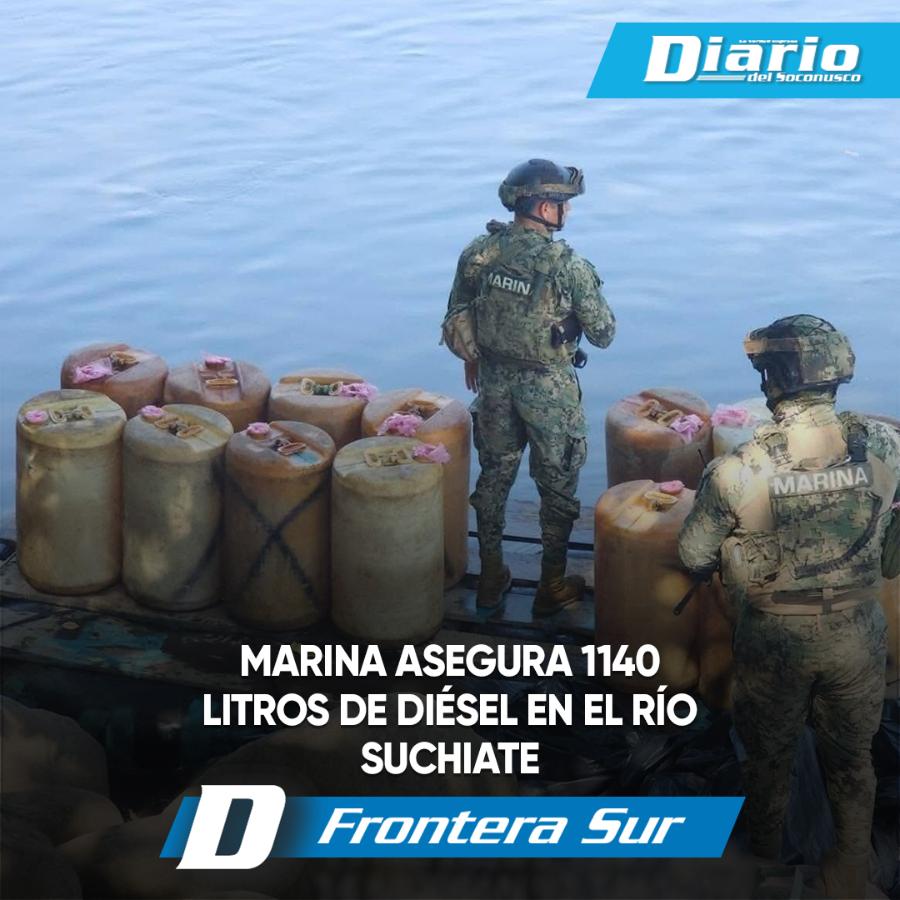 El aseguramiento se realizó durante recorridos de vigilancia terrestre, cuando elementos de la Marina detectaron varios bidones en aparente estado de abandono sobre una balsa en el río Suchiate.