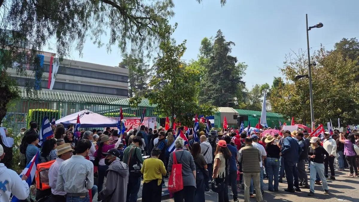 Ciudad de México. Con música, banderas y víveres, un numeroso grupo de simpatizantes se congregó este domingo frente a la Embajada de Cuba en México para solidarizarse con la isla y condenar el bloqueo petrolero que les impuso Estados Unidos.