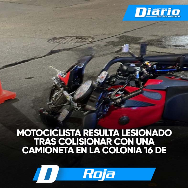 Un percance vehicular se registró en el cruce de la 7ª Avenida Sur Par Vial y la 18ª Calle Oriente, en la colonia 16 de Septiembre, donde el conductor de una motocicleta resultó lesionado tras colisionar contra una camioneta.