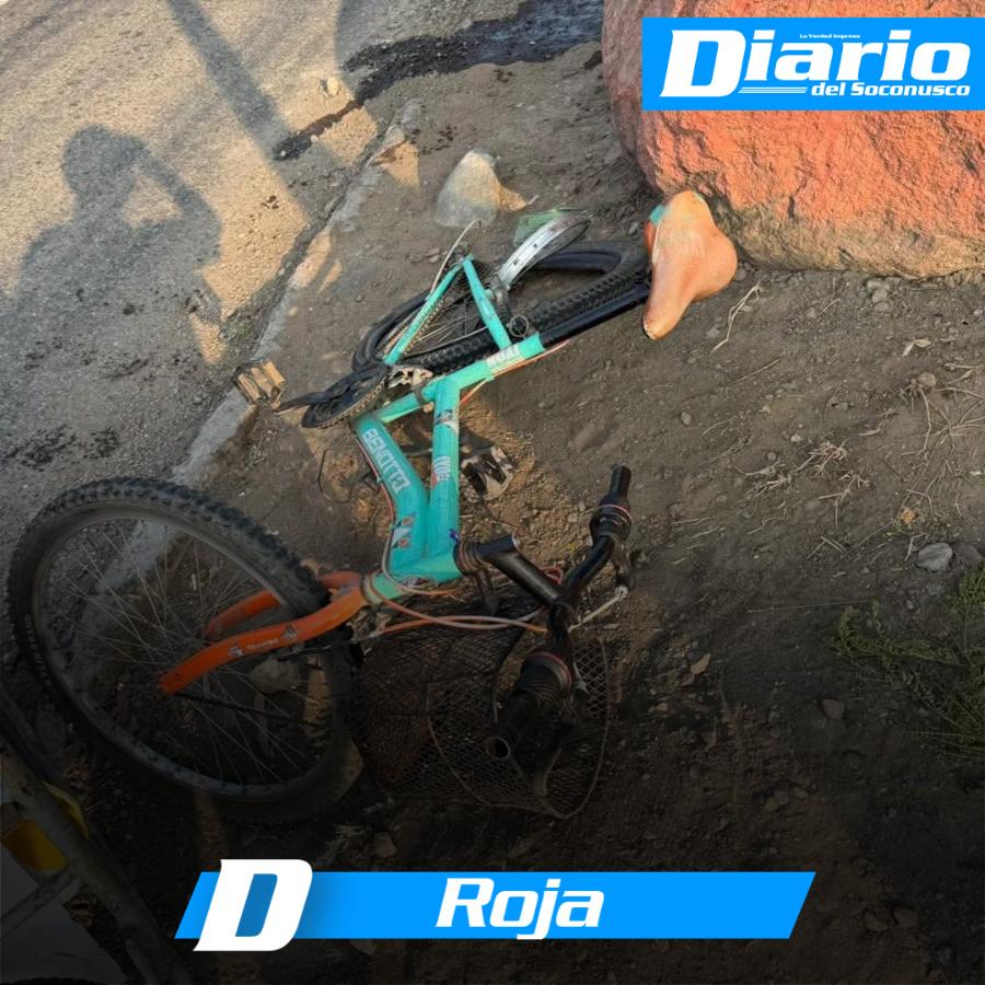 En el lugar tuvieron a la vista una bicicleta marca Benotto, tipo montaña, color azul turquesa, la cual presentaba daños materiales severos. También una motocicleta marca Honda, color rojo, que registró afectaciones en su carrocería.