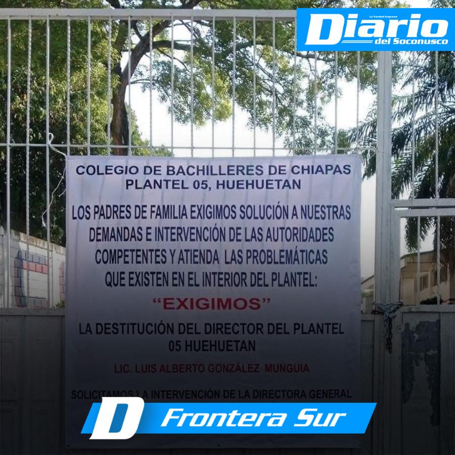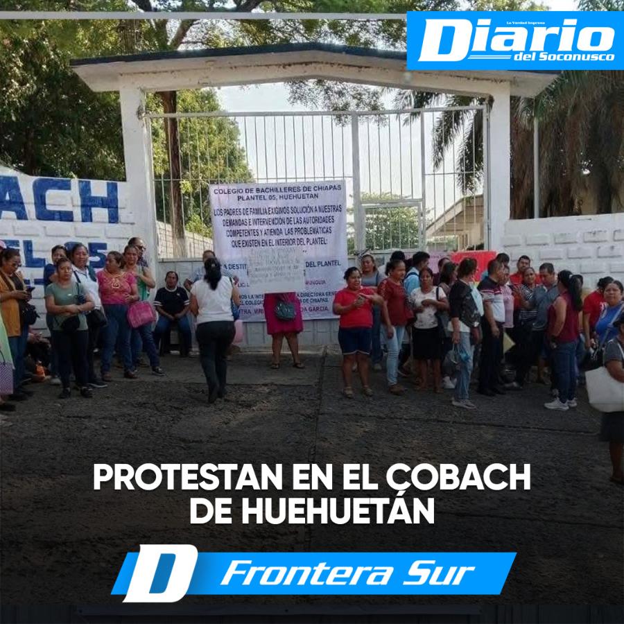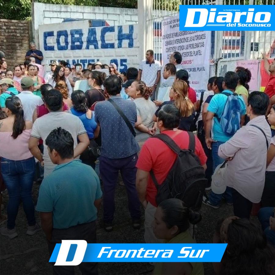 Padres y madres de familia del Colegio de Bachilleres de Chiapas (Cobach) 05, con sede en Huehuetán, protestaron este martes afuera de dicho plantel, ante la inoperancia del director Luis Alberto González Munguía, quien a decir de los denunciantes, es solapado por la titular de este sistema de bachilleres en la entidad, Viridiana Figueroa García.