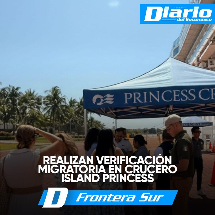 En el marco de las operaciones de control y supervisión en puertos marítimos internacionales, el Instituto Nacional de Migración (INM) en Chiapas llevó a cabo la verificación migratoria de 2 mil 777 personas que arribaron a bordo del crucero Island Princess, procedente de Puntarenas, Costa Rica, y con destino final a Huatulco, Oaxaca.